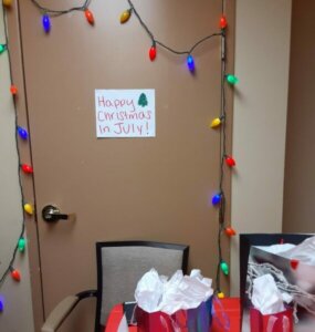 The summer heat faded away as the sounds of Christmas filled the air. Julia, Samaritan Music Therapist, led the group in a sing-along of Christmas carols as she played guitar. As the patients enjoyed music, Sue, Samaritan nurse assisted them with delicious cake and presents. The joy radiated in the room and their smiles filled the team with joy. It was a beautiful day and a wonderful Christmas in July.